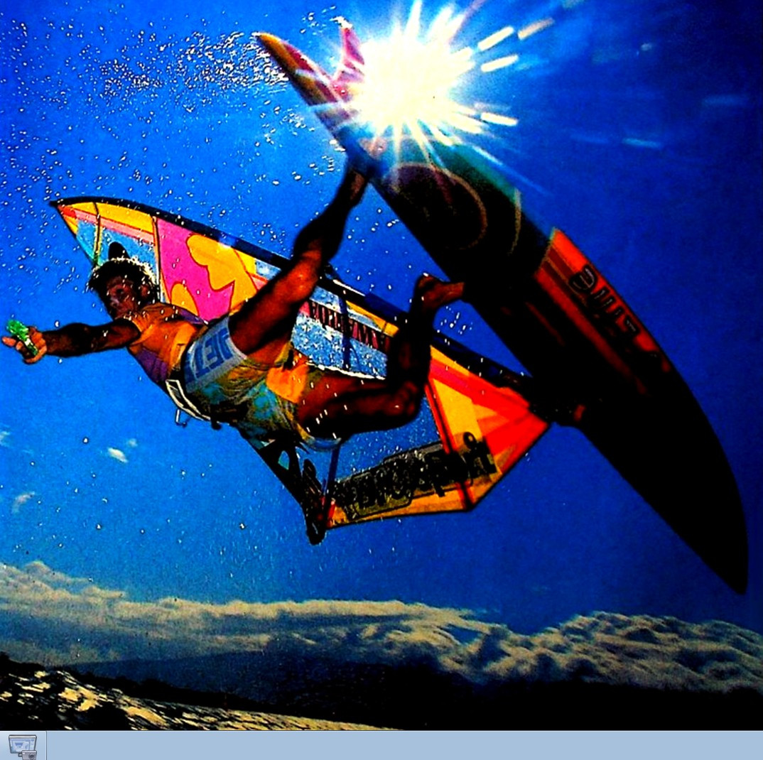 A windsurfer is caught mid-air in a dramatic jump, the colorful sail slicing through the deep blue sky while the sun explodes into a starburst above. Water droplets sparkle like diamonds around the athlete, frozen in time at the peak of action. The shot was captured on ,analog film, Fujichrome Velvia 50, a slide film known for its vibrant colors and sharp detail—perfect for amplifying the energy and intensity of the moment.