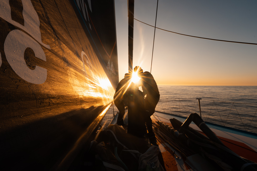 Onboard Malizia during The Ocean Race Europe, lighter conditions often brought as much excitement as windier days. As the sun rises over the Alboran Sea, the crew works in silence, adjusting sails with every subtle shift of wind, fighting for every meter with surrounding competitors. The rays of light bursting through the sailors mirror their energy and focus, capturing a moment of quiet intensity.