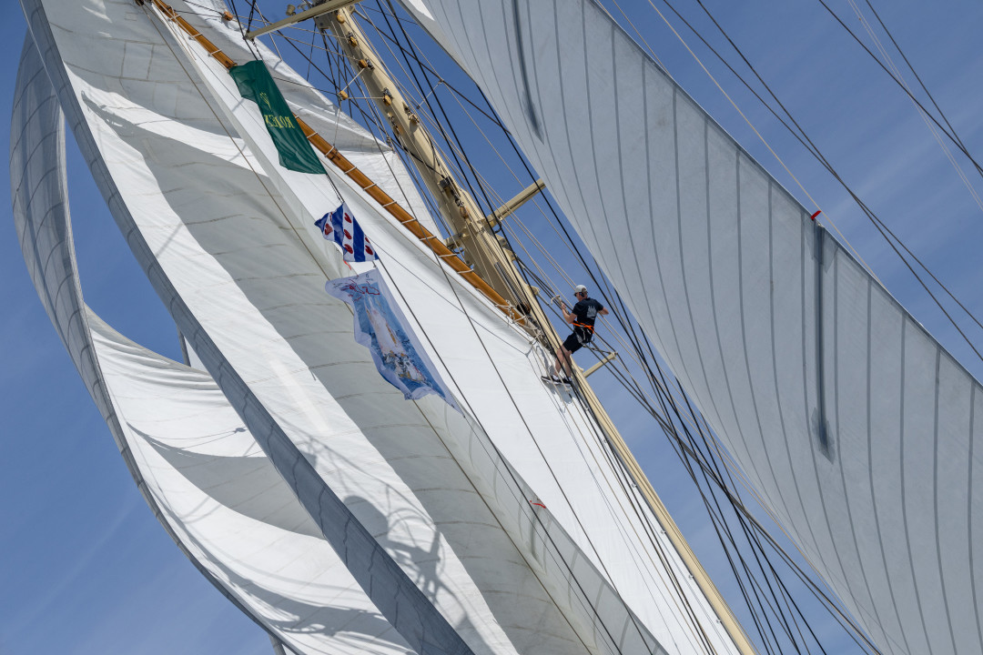 The legendary three mast schooner Atlantic replica was racing for the first time at Les Voiles de Saint-Tropez 2025. As the start was given few minutes earlier, the giant boat was still establishing its full sail plan including the three floating fisherman which implied to have a man at the top of the rig for while.