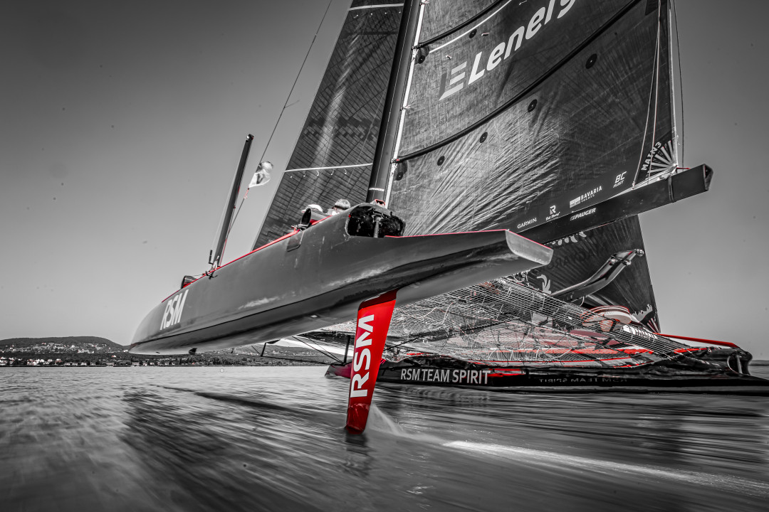 I wanted to show the extraordinary speed of a multihull, so I went as close as possible to the catamaran RSM Team Spirit (AC45), and was amazed by the way the shoreline was reflected in its hull.