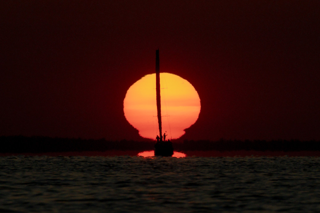 The photo was taken at the finish line of the Silver Ribbon sailing race - at sunrise. The race is unique in that it starts in the evening, it is primarily a night race. The special thing about the picture is that it was taken on a lake. The boat has already left the Tihany Strait. It is a rare occasion that the sunrise is visible through this. The strait divides the lake into two basins, and the picture clearly shows that there is no wind in the Eastern Basin.