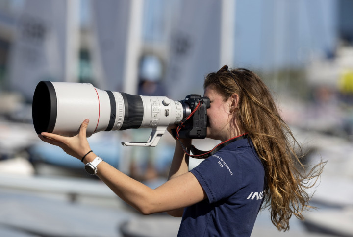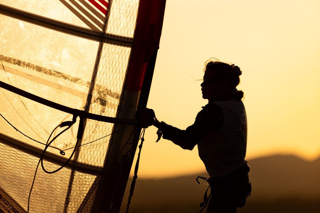 Day 6 of 8 of the Techno293 world championships regatta and we’d had a whole range of conditions. Very light winds, medium breeze, bright sun and moody skies. I was given a final chance for a different colour palette when light winds in the early afternoon prevented racing. Tired sailors went out into the evening sun after already completing two races in the morning for two more races of the day. I was able to position myself in a suitable spot to capture the finish of the final race on the red course; this was shooting almost directly into the sun. This silhouetted figure and monochrome image ended up being my favourite of the event due to its impact, anonymity and simplicity.